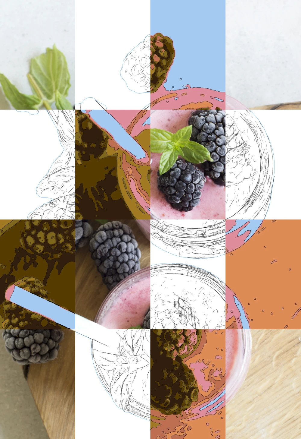 A saída da grade adapta-se às proporções da imagem e destaca as linhas estruturais dominantes, ajudando a estabelecer um espaçamento consistente e a hierarquia visual.